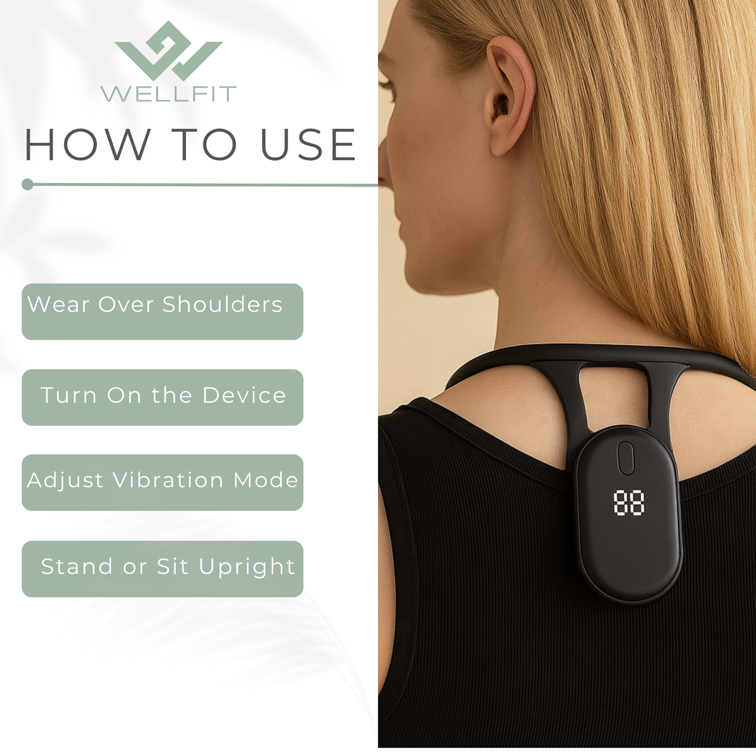 The WELLFIT™ Smart Posture Corrector uses intelligent vibration sensors to gently remind you when your posture starts to slouch.